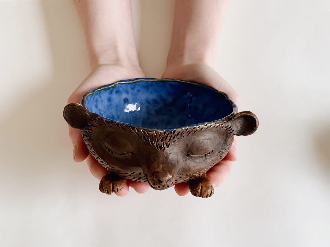 Осталось дорисовать ресницы, иголки, подушечки на лапках и выбрать глазурь. Снаружи мисочка будет покрыта молоком, что дает приятную, почти деревянную фактуру.
